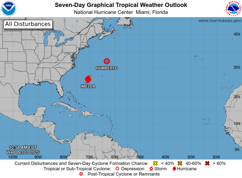 La Administración Nacional Oceánica y Atmosférica (NOAA, en inglés) previó una temporada ciclónica “superior a lo normal”, al estimar entre 13 y 18 tormentas tropicales, de las que entre cinco y nueve podrían transformarse en huracanes.https://listindiario.com/las-mundiales/20251001/huracan-imelda-amenaza-bermudas-humberto-agita-costa-eeuu_876446.html