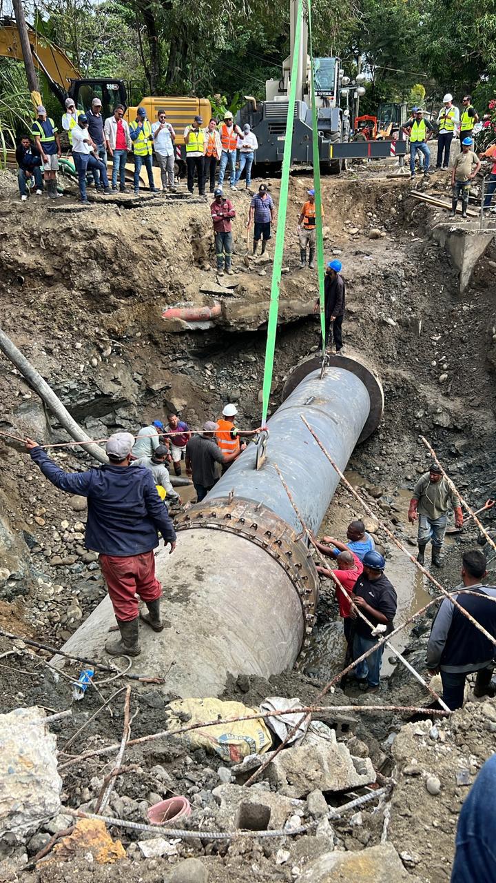 Sabana Iglesia.– La Corporación del Acueducto y Alcantarillado de Santiago (Coraasan) y el Instituto Nacional de Aguas Potables y Alcantarillados (INAPA), avanzan en la fase final de los trabajos para la solución definitiva de la avería registrada en la tubería de aducción del acueducto Cibao Central, infraestructura clave que abastece de agua potable a las ciudades de Santiago y Moca.