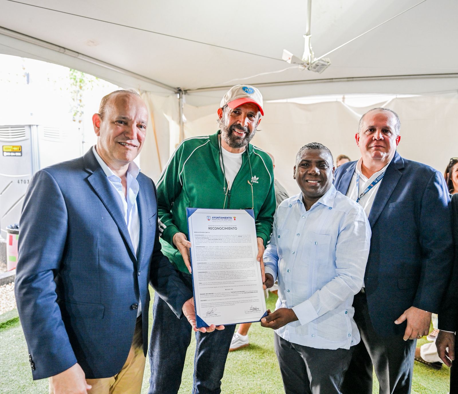 El acto de reconocimiento fue realizado detrás de la tarima instalada para los conciertos en el Estadio Cibao. Estuvieron presentes el presidente del Concejo de Regidores, Cholo D’Óleo, Arismendi Dajer, secretario general del Ayuntamiento y el secretario municipal, Luis José Cruz, quien dio lectura formal a la resolución.